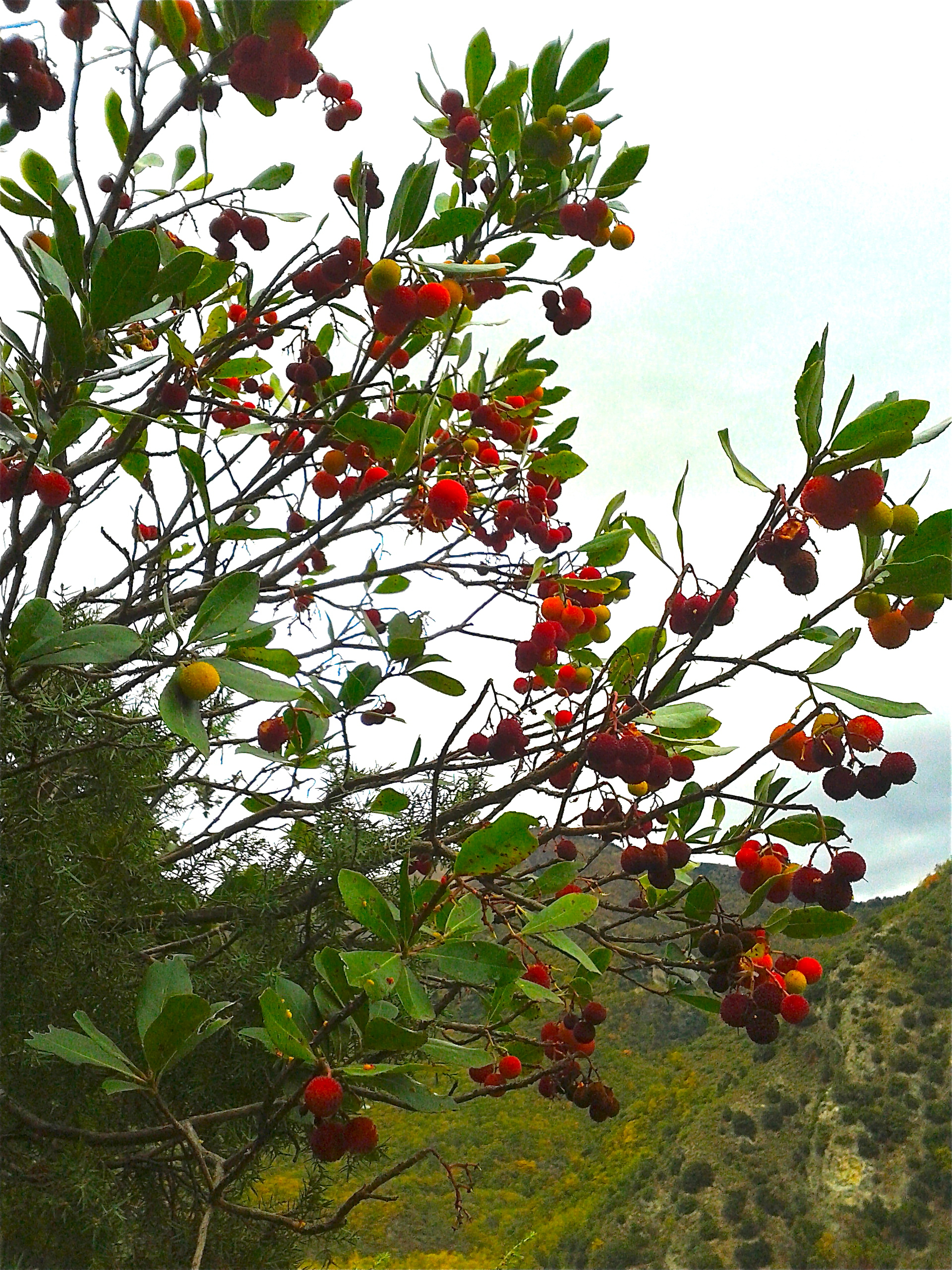 What we found on our gathering hike today can only be picked once a year and is the berry of the Arbutus Unedo. What the hell is that? It’s also known as the Strawberry tree or Cane apple. It’s a small tree found in the Mediterranean region and oddly enough Ireland. It’s a small red skinned berry with orange insides. It’s best in jam or cooked as too much of its raw version is toxic. The roots, leaves and branches can be used on their own as medicines as they are anti-inflammatory and diuretic apprently. Anyway, you have wikipedia to help you out ont his part and to know more about the plant in general.