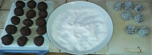 - Pour the coconut flakes in a plate and roll the newly formed energy balls in them so they are fully covered of them.