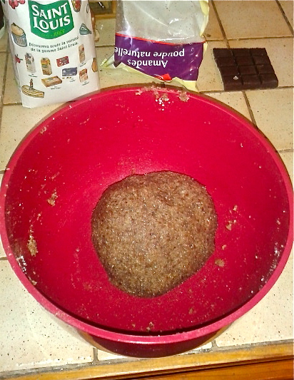 - In a bigger ball, stir the almond meal and sugar. Add the water, mix with your hands and it form a ball with the dough.