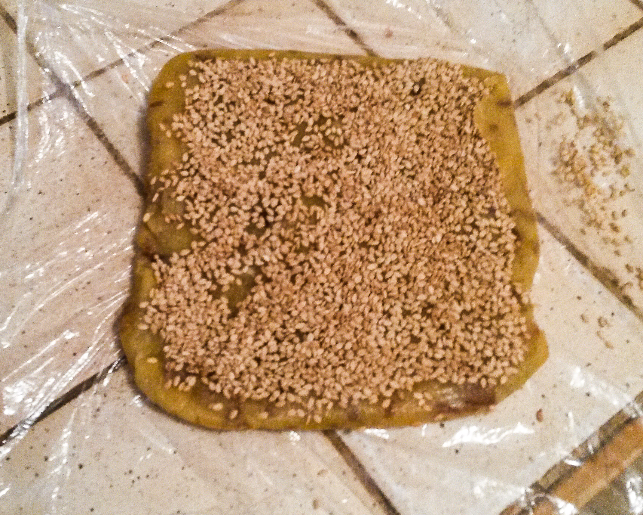 - Sprinkle sesame seeds on top of the flatten mixture and fold in half.
